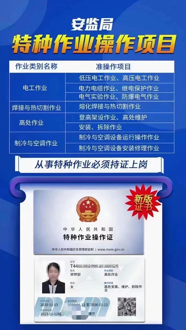 低壓電工操作證,高壓電工操作證,熔化焊接與熱切割作業(yè),焊工操作證,電力電纜,繼電保護,電氣試驗,防爆電氣作業(yè),高處安裝維護拆除作業(yè),登高架設(shè)作業(yè),制冷與空凋設(shè)備運行操作作業(yè),制冷與空凋設(shè)備安裝修理作業(yè),施工吊裝作業(yè),施工挖裝作業(yè),危化品負責(zé)人/管理人員,危化品從業(yè)人員上崗證。
