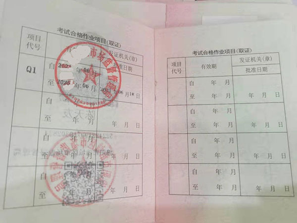 《特種設備作業證》工種:特種安全設備管理A,起重機指揮Q1,起重司機(限門座式起重機)Q2,起重司機(限橋式起重機)Q2,起重司機(限門式起重機)Q2,起重司機(限纜索式起重機)Q2,起重司機(限塔式起重機)Q2,起重司機(限流動式起重機)Q2,起重司機(限升降機)Q2,叉車司機N1,觀光和觀光列出司機N2,電梯維修T,鍋爐壓力容器壓力管道管理A,電梯管理A,起重機械管理A,場(廠)內專用機動車輛管理A,工業鍋爐司爐G1,電站鍋爐司爐G2,鍋爐水處理G3,快開門式壓力容器操作R1,移動式壓力容器充裝R2,氣瓶充裝P,金屬焊接操作(壓力焊PE焊),非金屬焊接操作(壓力容器焊),食品檢驗員,化學檢驗員,農產品檢驗員! 特種設備作業證是由質監局"頒發"的證特種設備作業證,每4年一審。